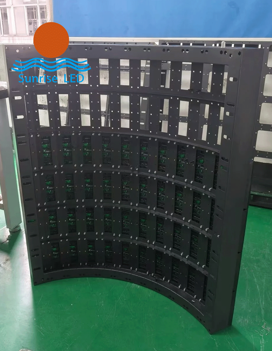In the past, the module mounting surface of an arc-shaped cabinet was bent into polygonal planes with 4–6 or more bends, and then square display modules were mounted on these bent surfaces to form a near-arc display surface. Multiple arc-shaped unit cabinets were then assembled together to create a large-area curved LED display.